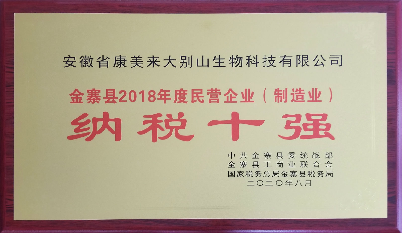 近日,中共金寨縣委統戰部、金寨縣工商業聯合會、國家稅務局金寨縣稅務局聯合開展了金寨縣民營企業納稅排序工作,依據注冊地在金寨縣的民營企業2018年度繳納的稅收實績,授予安徽省康美來大別山生物科技有限公司“金寨縣2018年度民營企業(制造業)納稅十強”稱號。