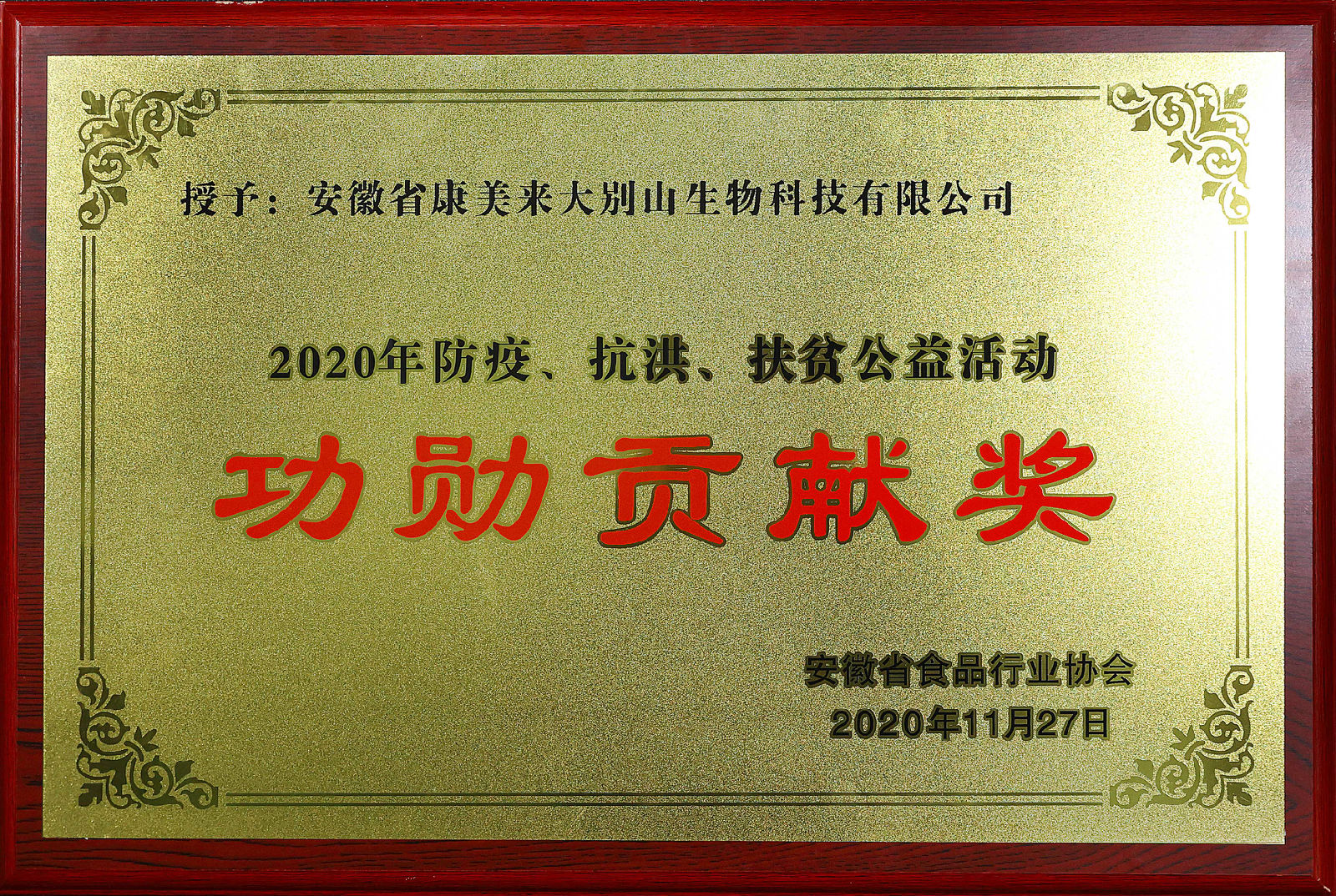 2020年11月27日,2020年度安徽省食品行業“防疫、抗洪、扶貧”公益表彰大會 在安徽合肥濱湖會展中心舉行。安徽省食品行業協會根據康美來公司在2020年防疫、抗洪、扶貧方面的突出貢獻,授予安徽省康美來大別山生物科技有限公司“2020年防疫、抗洪、扶貧公益活動功勛貢獻獎”稱號。