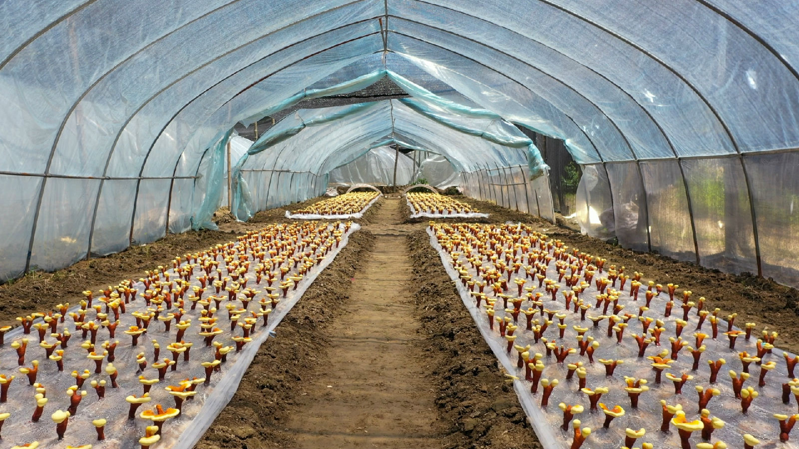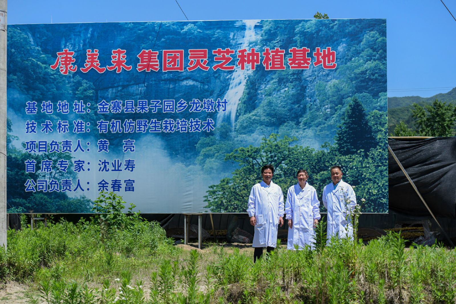 仲夏的大別山,萬物并秀,滿目蒼翠。6月5日上午,康美來集團董事長余春富和靈芝栽培技術首席科學家沈業(yè)壽教授一起前往大別山腹地金寨縣果子園鄉(xiāng)龍墩村仿野生有機靈芝種植基地視察,先前抵達的基地負責人黃總已在基地等候。余董一下車就直奔靈芝大棚。