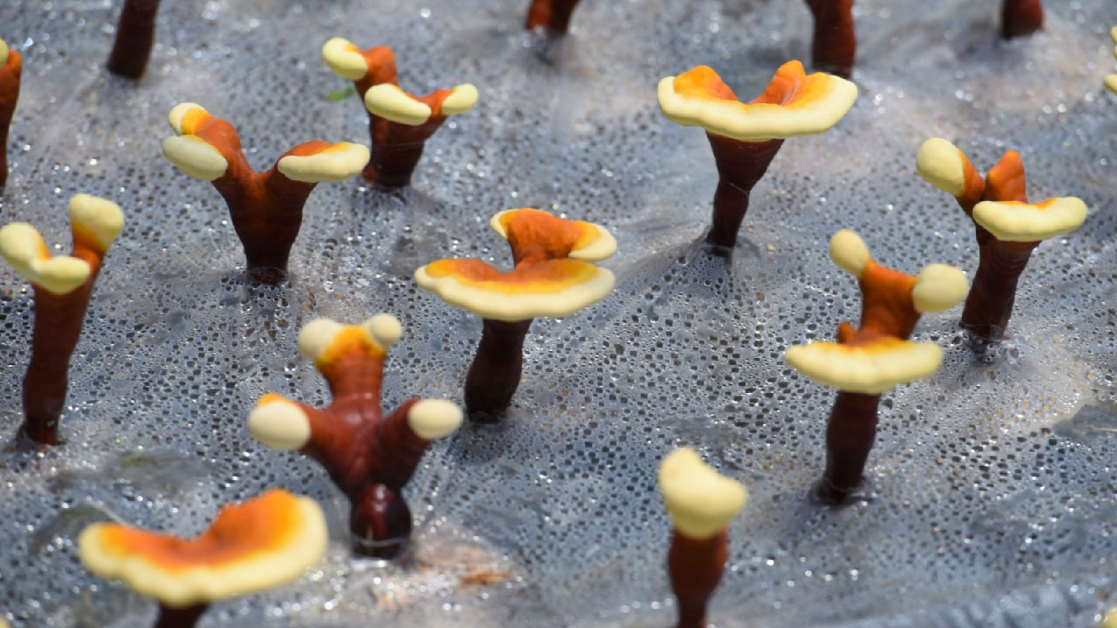 走進靈芝基地,一排排整齊的大棚嚴整壯闊,與四周連綿的青山相映成趣,棚內一棵棵靈芝整齊排列,朵朵嫩蕾色彩嬌艷,構成了一幅美麗的夏日畫卷。黃總介紹:這塊基地面積20畝,菌棒已開始發(fā)芽,正處于菌桿生長階段。沈業(yè)壽教授考察后指出:現(xiàn)蕾階段的靈芝需要精心觀察護理,防止雜菌感染。