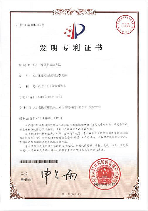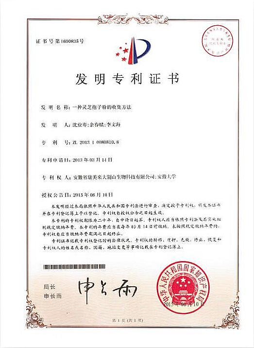 六、應用國家發明專利技術。我公司通過自主科技創新,擁有兩項國家發明專利技術:“一種靈芝栽培方法”,專利號:ZL201310080809.5 ;“一種靈芝孢子粉的收集方法”,專利號:ZL201310080810.8。