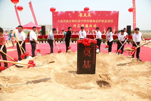 我公司新廠六安丹皇生物科技有限公司總經理趙欣在會上作了項目介紹和表態發言。項目總投資1.5億元,征地面積85.6畝,總建筑面積55000平方米,將建成國際領先的保健品和護膚品生產線,年產值達20億元。余春賦董事長率公司全體員工列隊迎接市領導親臨現場,為我公司新廠區項目奠基。