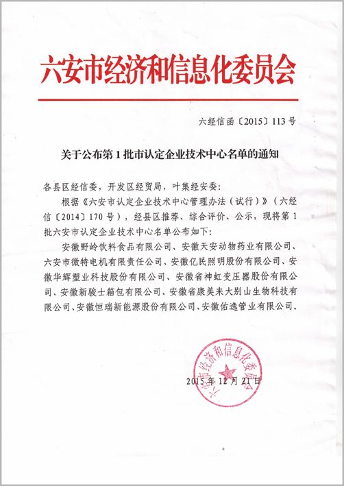 2015年12月21日,六安市經濟和信息化委員會公布了第1批市認定企業技術中心名單,安徽省康美來大別山生物科技有限公司榮登之列。這是六安市政府對康美來公司自主創新能力的充分肯定和積極鼓勵。市企業技術中心的認定,將進一步提升公司產品市場競爭力和知名度,為企業長遠發展、科學發展奠定堅實基礎。