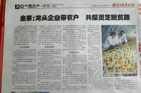 自康美來公司主辦的“2016大別山靈芝文化節”開展以來,以康美來為龍頭的帶動老區農民精準脫貧產業模式引起各級政府及主流媒體高度關注。金寨縣委縣政府最近決定,在全縣范圍推廣康美來吳家店靈芝基地與光伏發電土地融合的新模式。繼新華社主辦的新華網報道后,安徽省委機關報《安徽日報》7月29日在農村版報紙重點報道,以及走遍中國網、安徽財經網、安徽工人日報官網<皖工網>等國內各大新聞媒體爭相報道康美來,有力推動了以康美來為代表的金寨靈芝的對外宣傳和品牌打造。