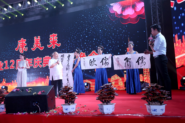 8月21日晚上,康美來12周年慶典文藝晚會在六安舉辦。著名表演藝術家、鄧小平特型演員盧奇親臨六安,登臺助陣,友情出演?!靶∑酵尽闭J為康美來的事業是一個造福人民群眾健康幸福的崇高事業,是功德無量的事業,是響應黨中央、國務院“精準扶貧”的事業,帶領老區人民脫貧致富。他贊賞并鼓勵康美來扎根大別山敢闖敢冒的精神,號召大家大膽創業,為中國夢而奮斗!作為書法家的盧奇還現場提筆潑墨,書寫“康美來靈芝好”六個大字,字如其人,展現出書法功底,并贈送余春富董事長,慶賀康美來12周歲生日和集團成立。