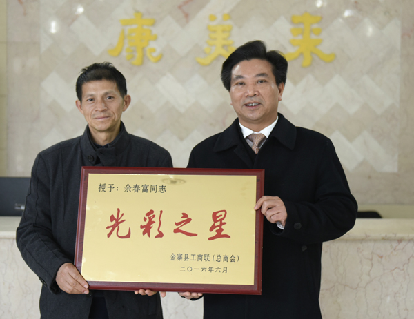 2017年1月11日,金寨縣工商聯(lián)領(lǐng)導(dǎo)專程到安徽省康美來大別山生物科技有限公司舉行上門授牌儀式,余春富董事長(zhǎng)接受獎(jiǎng)牌。