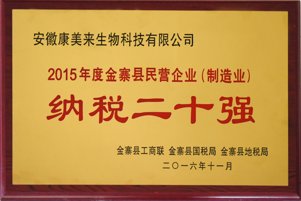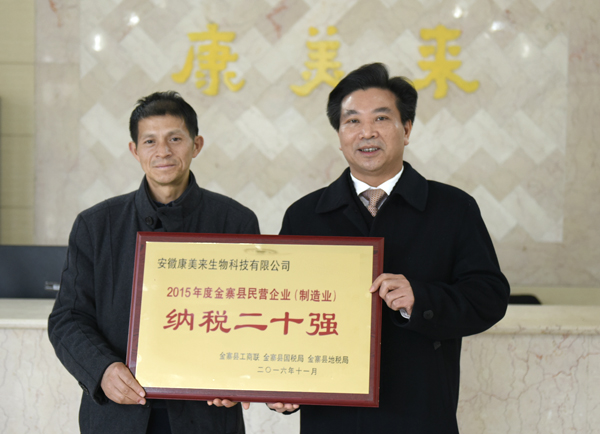 2016年12月,金寨縣工商業(yè)聯(lián)合會(huì)、國(guó)家稅務(wù)局、地方稅務(wù)局聯(lián)合發(fā)文《關(guān)于公布金寨縣民營(yíng)企業(yè)(制造業(yè))2015年度納稅20強(qiáng)的通知》(金聯(lián)【2016】28號(hào)),按照2016年度縣政府工作計(jì)劃安排,縣工商聯(lián)、縣國(guó)稅局、縣地稅局聯(lián)合開展了“金寨縣民營(yíng)企業(yè)(制造業(yè))納稅20強(qiáng)排序活動(dòng)”,安徽省康美來大別山生物科技有限公司榮獲2015年度全縣“納稅20強(qiáng)”企業(yè),并且納稅總額排名靠前。(康美來大別山生物科技僅是康美來集團(tuán)的一家核心子公司,金寨縣排名不代表總部在六安的集團(tuán)公司)。