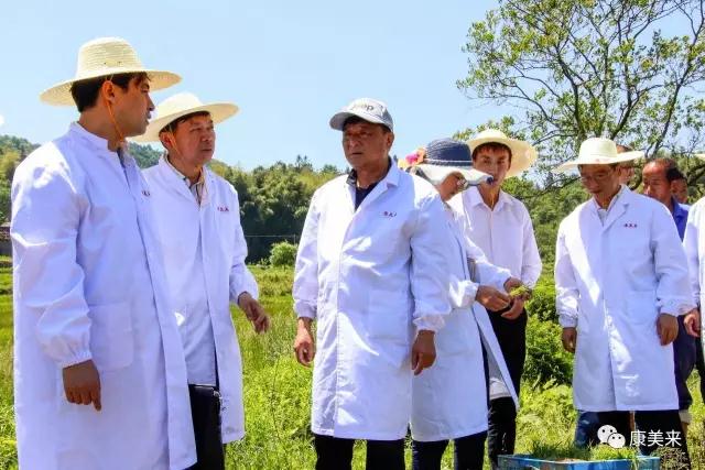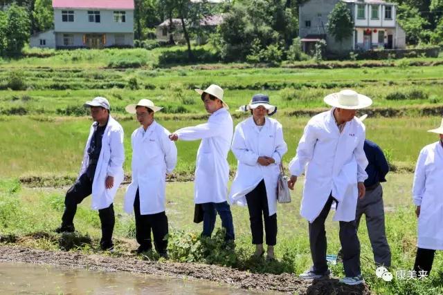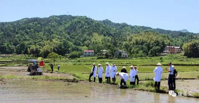 2017年5月13日上午,安徽農業大學丁克堅教授帶領高山有機米產業聯盟專家一行,在金寨縣農發委有關領導和公司總裁助理尹維龍的陪同下,來到康美來集團云湶谷股份公司金寨縣長嶺鄉高山有機稻種植基地對有機稻插秧生產指導。