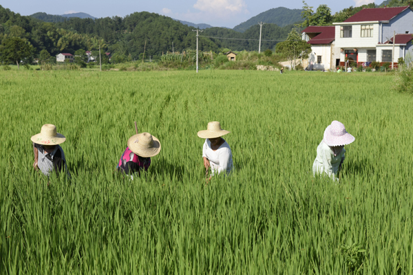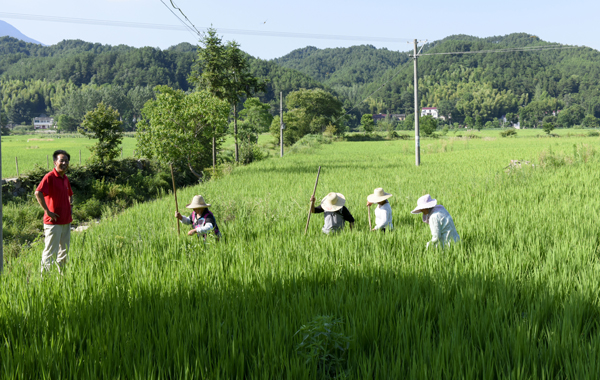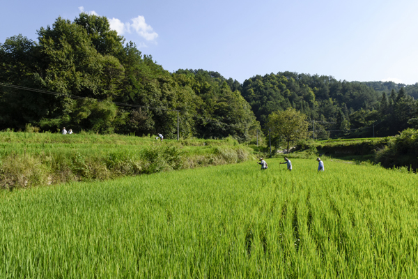 7月23日,余春富董事長和安徽農(nóng)業(yè)大學(xué)專家丁克堅(jiān)教授、李福寶教授專程前往康美來集團(tuán)云湶谷公司大別山長嶺農(nóng)場,觀察高山有機(jī)香稻生長情況,50多位農(nóng)場農(nóng)民工正在稻田里除草,用人工的方法,拔掉每一顆雜草。董事長說,這種原始方法我們雖然人工成本高,但堅(jiān)決不用除草劑,嚴(yán)格按有機(jī)稻標(biāo)準(zhǔn)生產(chǎn)作業(yè)。云湶谷農(nóng)場是康美來會(huì)員自家的農(nóng)場,確保高品質(zhì)生產(chǎn),不打農(nóng)藥,不施化肥,不用除草劑。