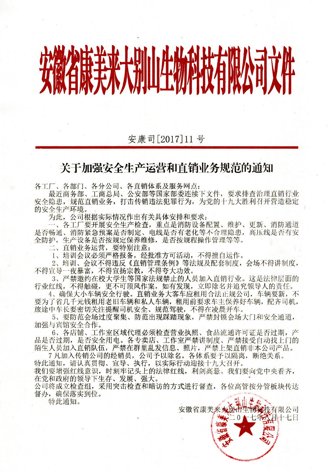 關于加強安全生產運營和直銷業務規范的通知