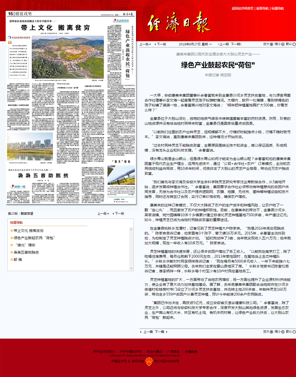 《經(jīng)濟(jì)日報(bào)》今日刊發(fā)康美來集團(tuán)精準(zhǔn)扶貧采訪文章:“康美來集團(tuán)以現(xiàn)代農(nóng)業(yè)理念做大大別山靈芝產(chǎn)業(yè)——綠色產(chǎn)業(yè)鼓起農(nóng)民‘荷包’”