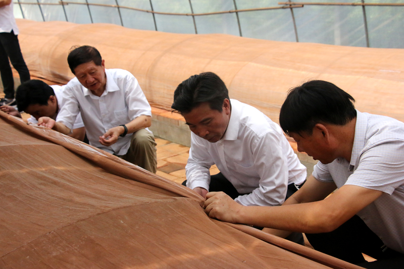 8月28日,余春富董事長、沈業壽教授親赴金寨吳家店基地、沙河基地做采收前驗收檢查。近500畝的基地,余董和沈教授冒著棚內高溫,一個棚一個棚抽查驗收,汗水濕透襯衣,對基地不同時段不同地塊孢子粉做出鑒定。沈業壽教授對基地孢子粉質量給予肯定,同時要求嚴格把關,擇優采收。