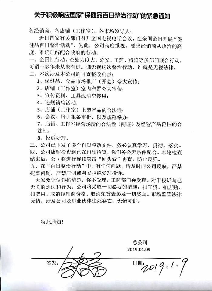 為此,公司董事長余春富高度重視,表示:堅決擁護國家對保健品的整治行動,康美來以講政治的高度認識這次行動,立即開展自查整改,自覺接受有關部門的檢查、監管。
