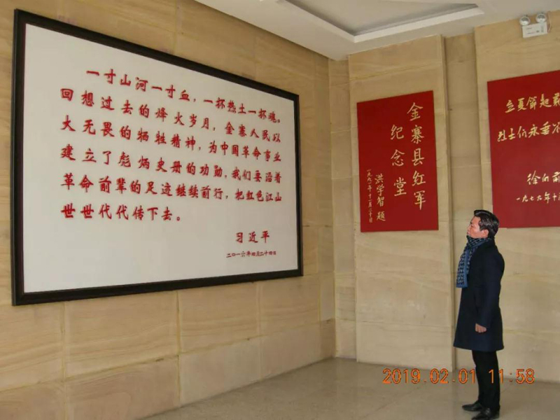 走進博物館大門,習近平、江澤民、劉伯承、徐向前、吳邦國等題詞在墻上整齊排列。在習近平親筆題寫的大字前,余春富董事長肅然起敬,默默念詞:“一寸山河一寸血,一抷熱土一抷魂。回想過去的烽火歲月,金寨人民以大無畏的犧牲精神,為中國革命事業建立了彪炳史冊的功勛,我們要沿著革命前輩的足跡繼續前行,把紅色江山世世代代傳下去”。