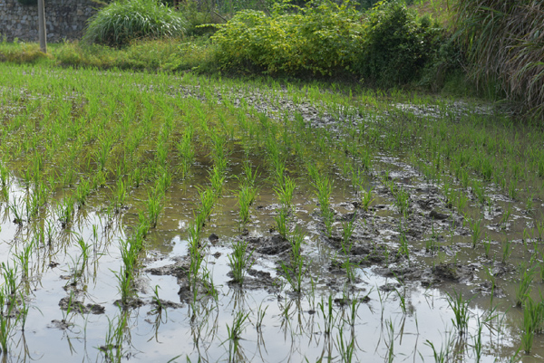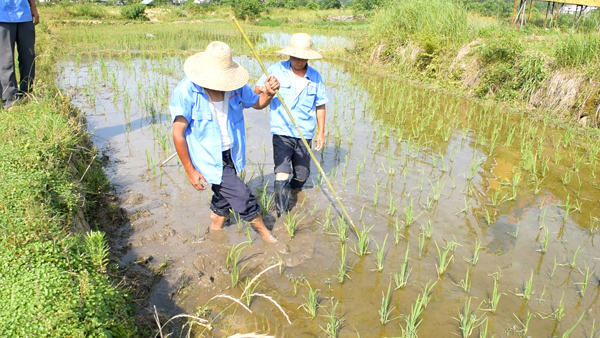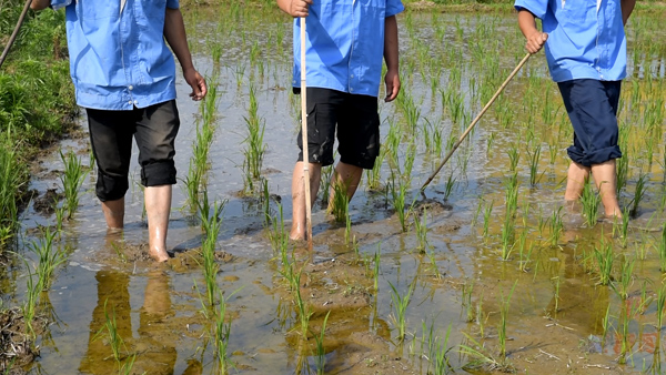 突然,我們看見一群農民“傻乎乎”站在稻田里,每人手拿一個桿子,腳在地上不斷地游動,讓司機把車子停下來,我們一探究竟。