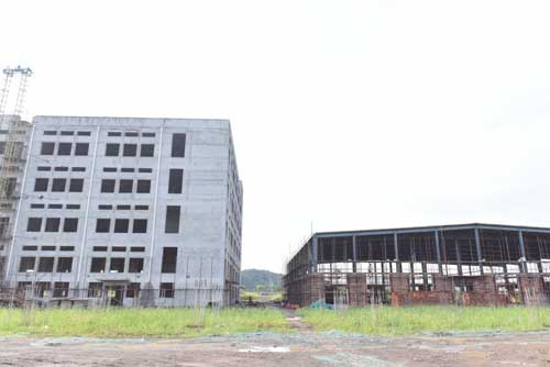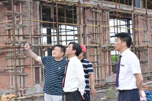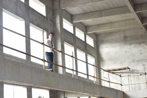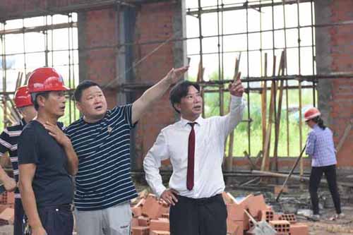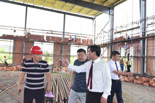 然后余董進(jìn)入正在建設(shè)的第二幢廠房培訓(xùn)中心。培訓(xùn)中心鋼結(jié)構(gòu)廠房目前正在墻面施工中,工人們正在壘磚砌墻。