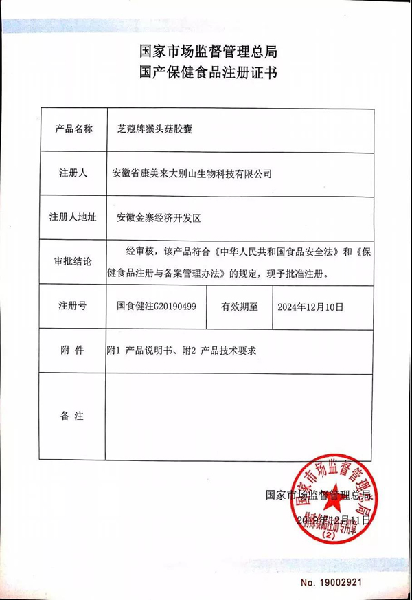 近日,國家市場監督管理總局對于康美來公司申報的國產保健食品“芝蔻牌猴頭菇膠囊”批準注冊,注冊號為 國食健注G20190499。