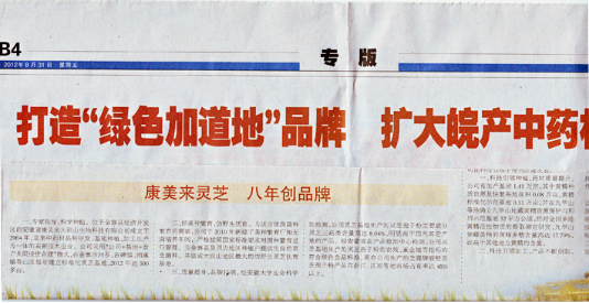 《安徽日報》于2012年8月31日,專版介紹皖藥振興發展情況及成功品牌展示,專篇大題目為《打造“綠色加道地”品牌,擴大皖產中藥材影響》,康美來公司作為省藥監局推薦的六家著名皖藥品牌之一,在專刊上報道,題目為“康美來靈芝,八年創品牌”。