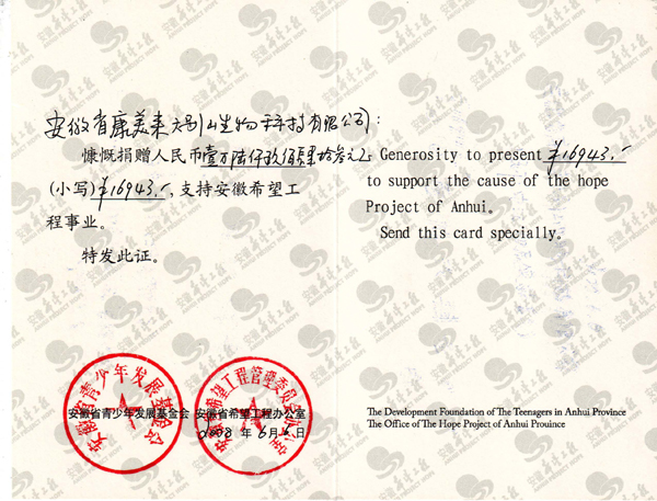 2008年6月,康美來公司通過安徽省青少年發展基金會、安徽省希望工程辦公室向安徽希望工程事業捐贈善款16943元,用于支持貧困地區基礎教育事業,幫助貧家子女走進課堂,成就夢想,讓落后地區擁有更多更好的學校和教學設施。