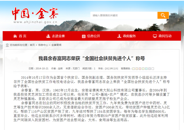 國務院扶貧辦授予余春富全國社會扶貧先進個人稱號